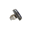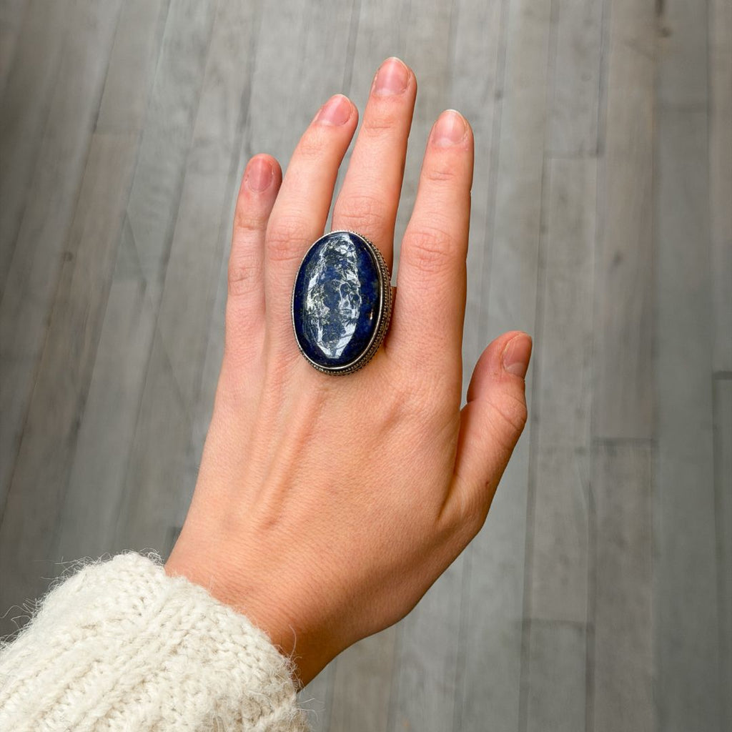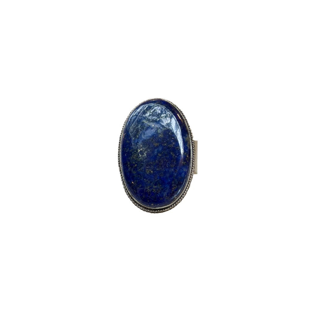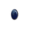 A lapis lazuli composite cabochon set in a silver-toned, ornately detailed, mixed-metal mounting. Organic variations in color and texture give each piece a one-of-a-kind presence.