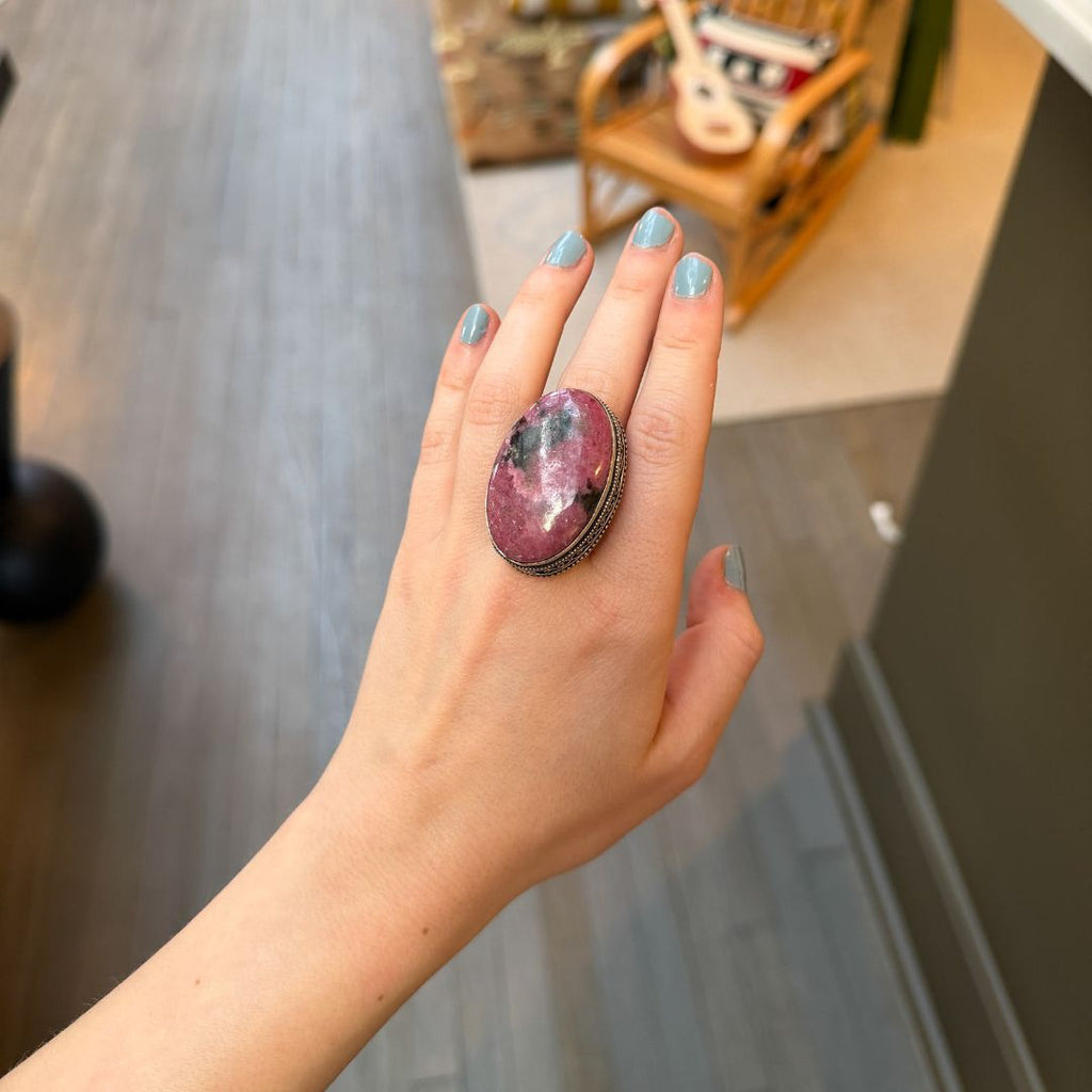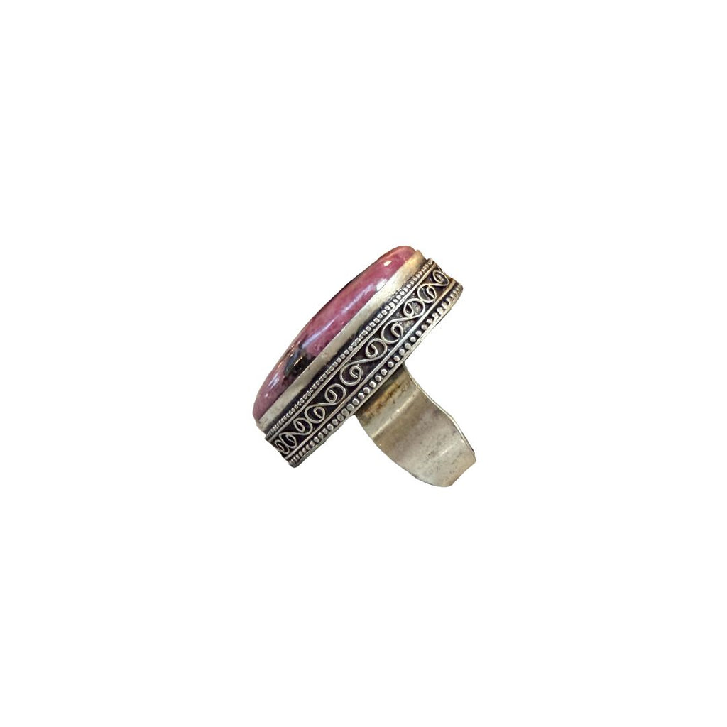A Rhodonite cabochon set in a silver-toned, ornately detailed, mixed-metal mounting. Organic variations in color and texture give each piece a one-of-a-kind presence