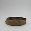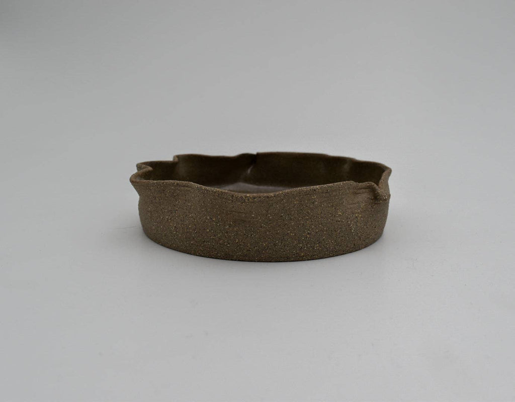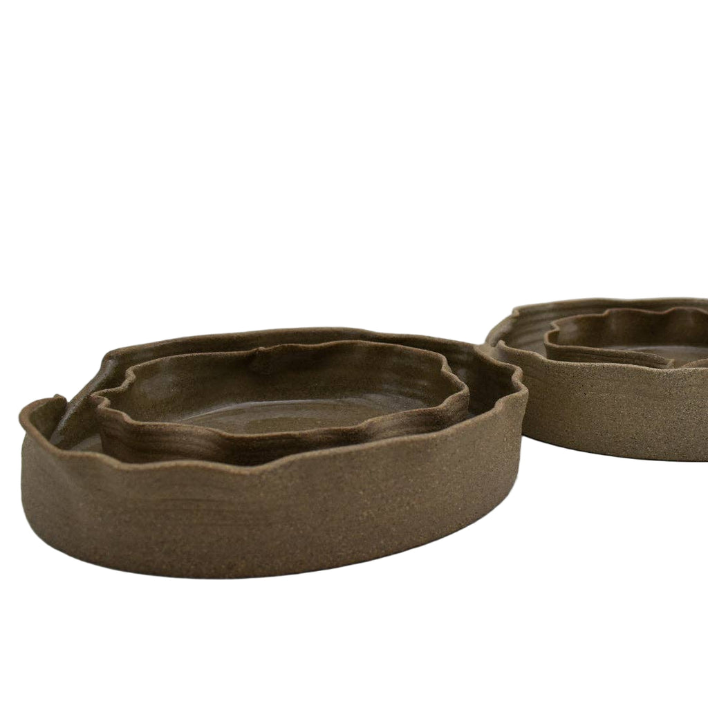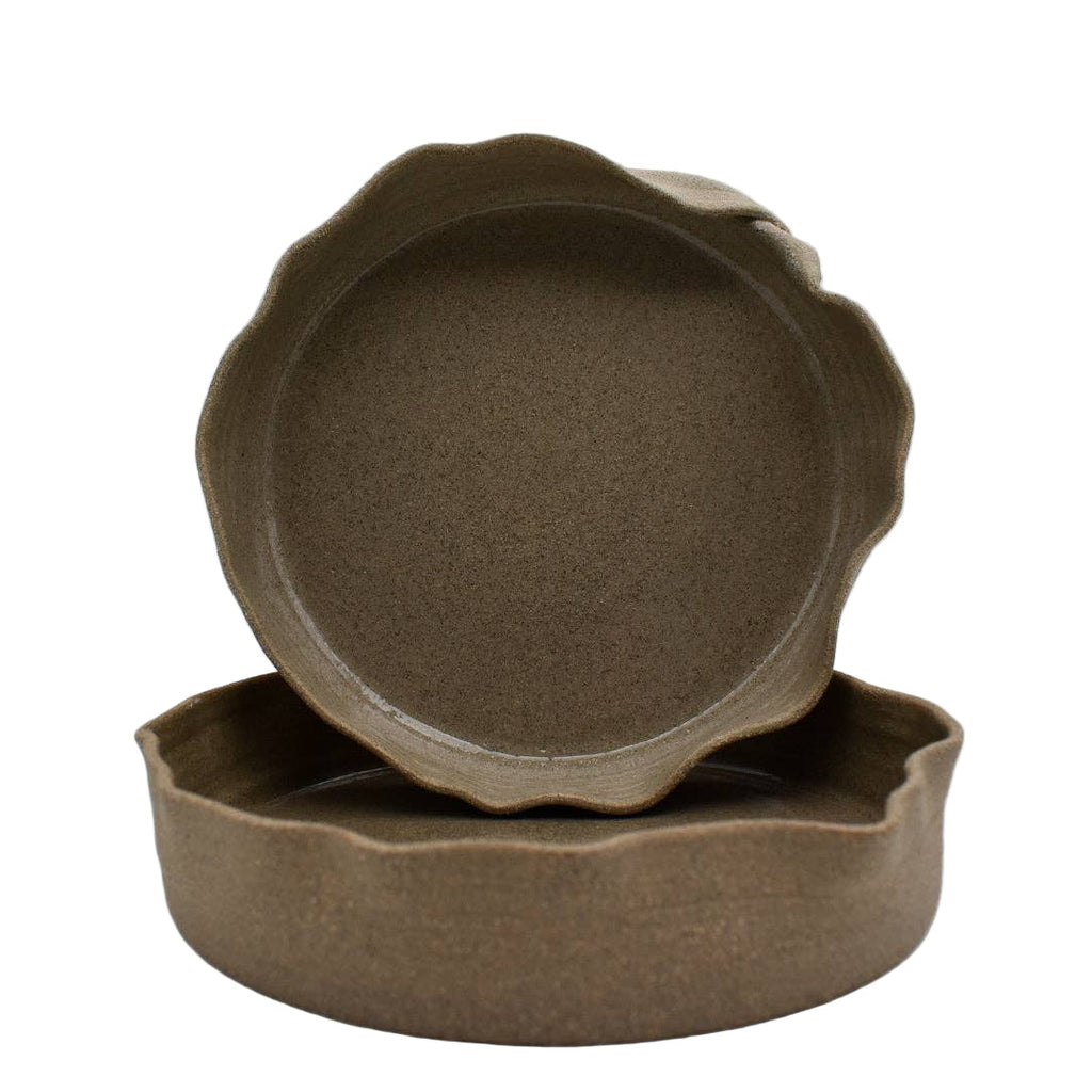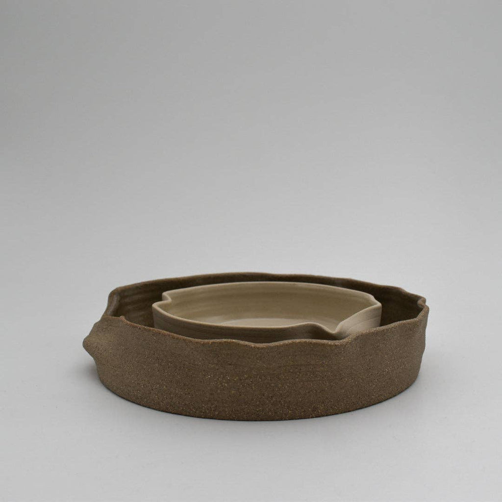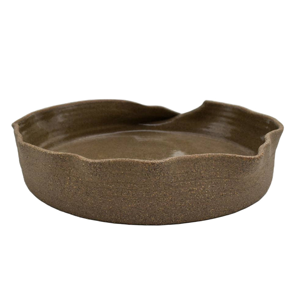A sculptural take on everyday dining, the BistroEarth Plate is wheel-thrown from stoneware clay and shaped with naturally irregular folds that make each piece one of a kind. The interior features a clear, glossy glaze for a smooth, functional finish, while the exterior remains unglazed to showcase the raw texture of the clay. Its organic form and wavy rim bring a warm, handcrafted presence to any table setting. Available in two sizes and two colorways, including the Sand version found in-shop. Subtle variations and unique markings are part of each plate’s character.