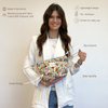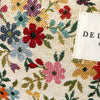 Toiletry bag with a zipper at the top and a small beige cord handle on the side. Made with jacquard fabric with a multicolor floral pattern on beige background. Lined with thick grey fabric on the inside. Ideal for traveling, going to the beach, or daily use.