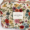Medium toiletry bag with a zipper at the top and a side handle. Made with jacquard fabric with a multicolor floral pattern on a beige background. Lined with thick grey fabric on the inside Ideal for storing makeup, facial creams, and small bottles.