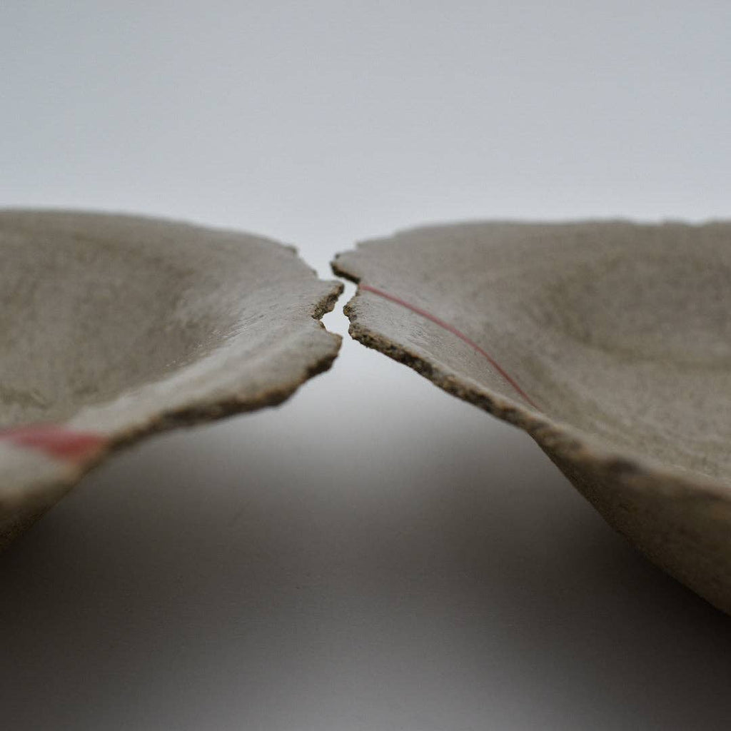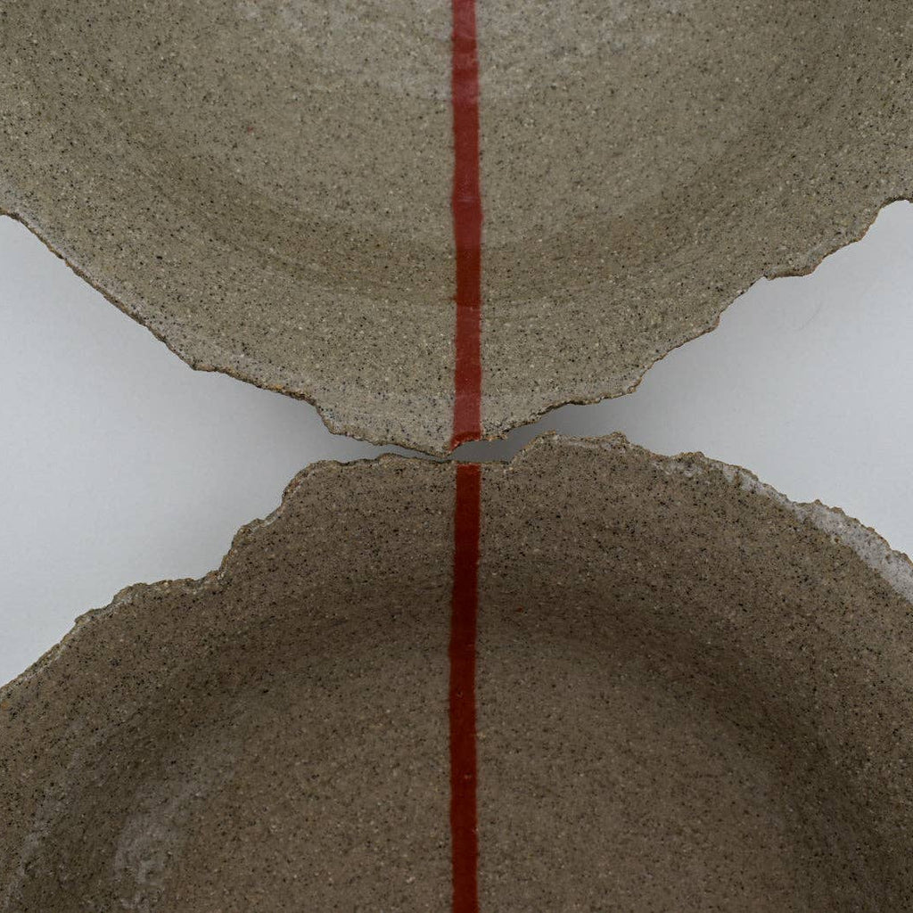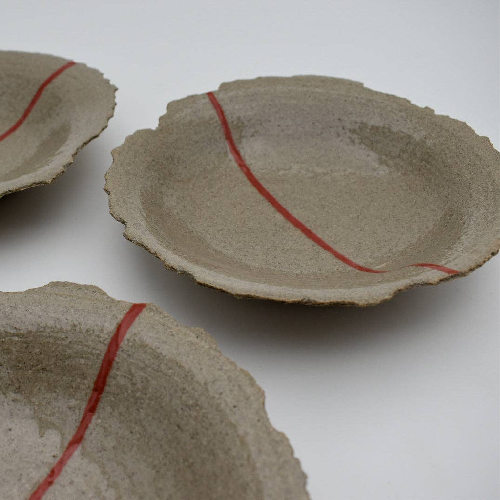 The Border Plate is a wheel-thrown stoneware piece defined by its organic edges and signature red line. Designed to highlight the raw beauty of hand-shaped ceramics, it features an unglazed exterior that emphasizes the natural texture of the clay and a glazed interior for everyday functionality. Each plate is crafted by hand, with subtle variations that underscore its one-of-a-kind character.
