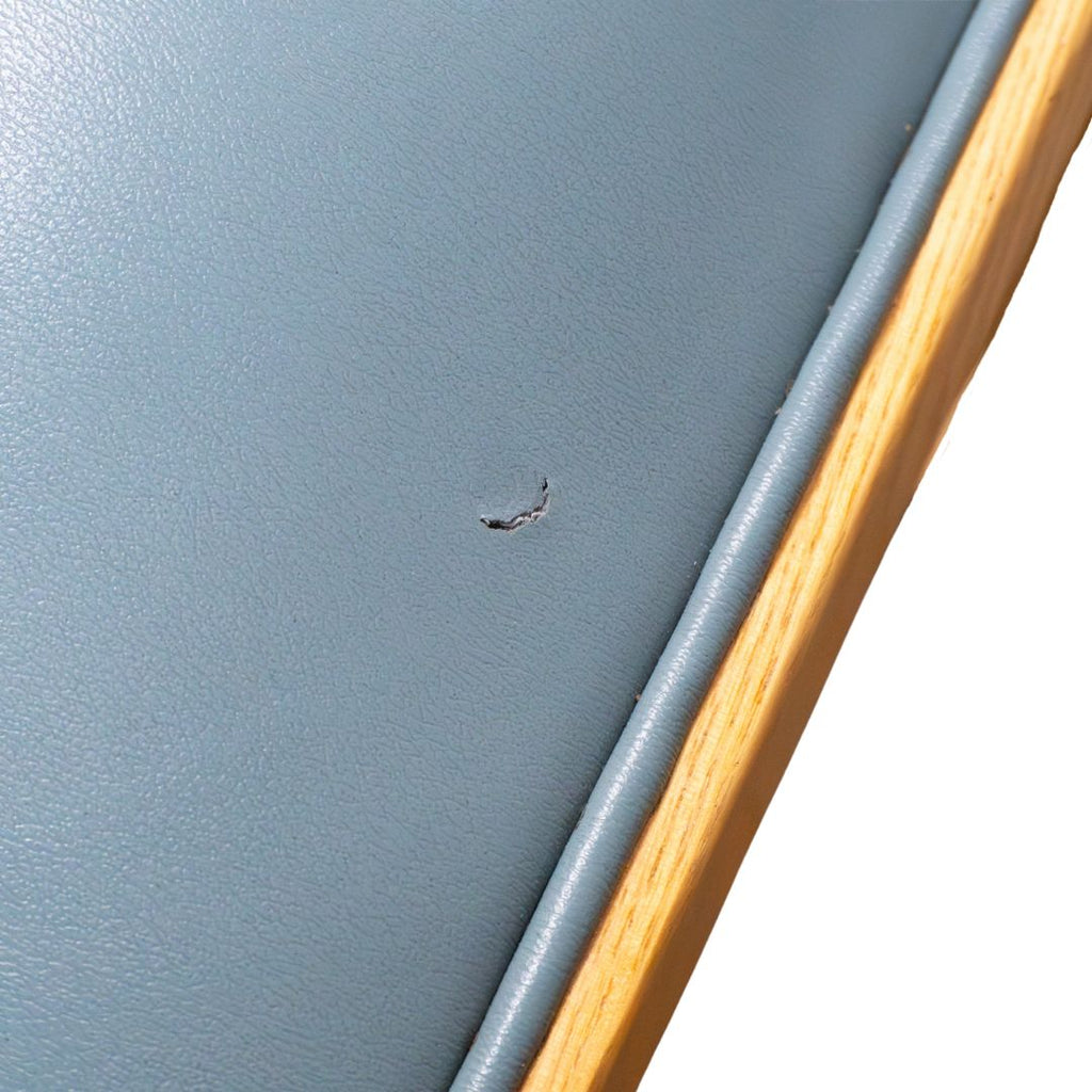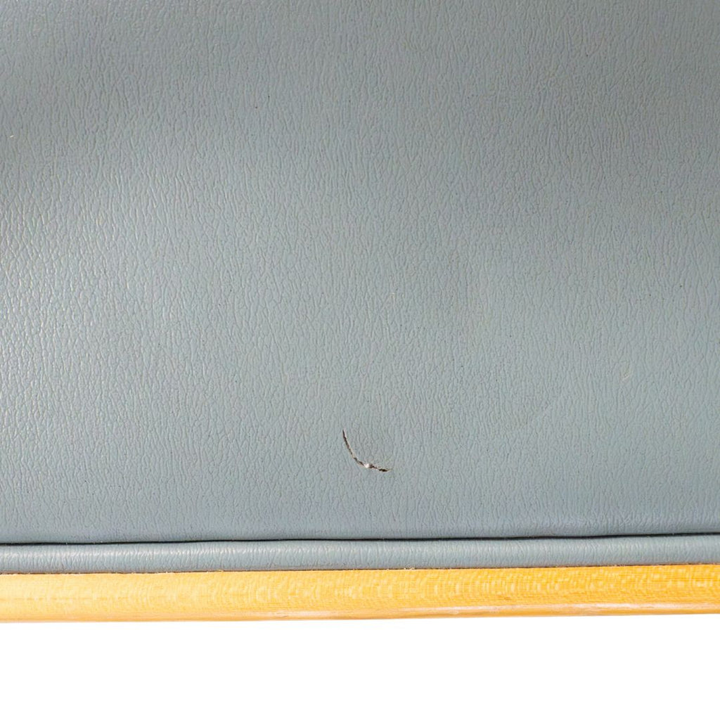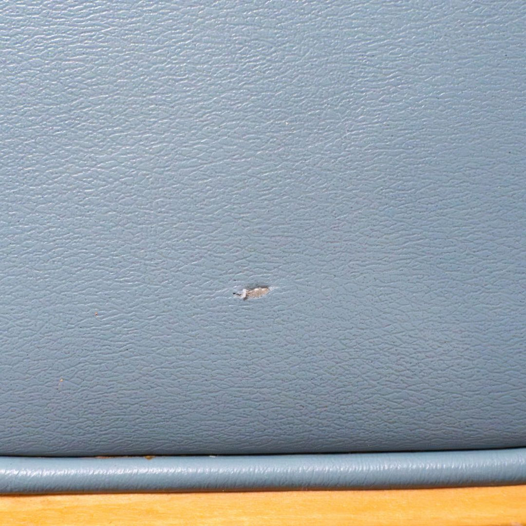 Wood has original finish with coloring and shows nice age and patina. Seats show small puncture damage on leather.