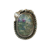 This bold ring features an oval composite stone in mossy green hues with soft variations and tonal depth throughout. Set in a silver-toned mixed-metal bezel with floral detailing and a beaded border.