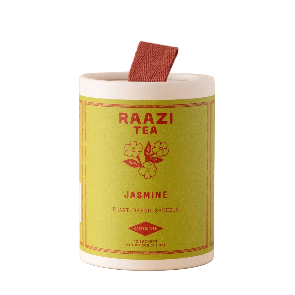 Our floral and vegetal jasmine green tea. This is a caffeinated Chinese green tea scented with jasmine flowers. Each box of Raazi Tea comes with 12 sachets made from a biodegradable, plant-based material, and are packaged into box made from recycled paper.