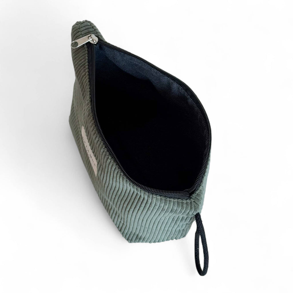 Large pouch with a zipper on top and a black cord handle on the side. Made from thick green corduroy fabric and lined. Ideal for travel, the beach, or daily use.