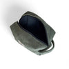 Medium-sized pouch with a zipper on top and a side handle. Made from thick green corduroy fabric and lined.