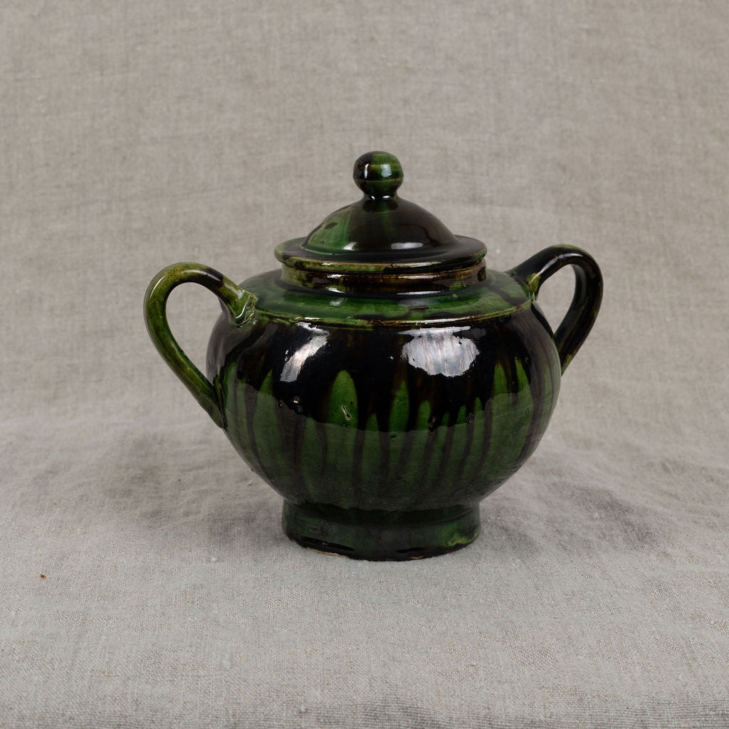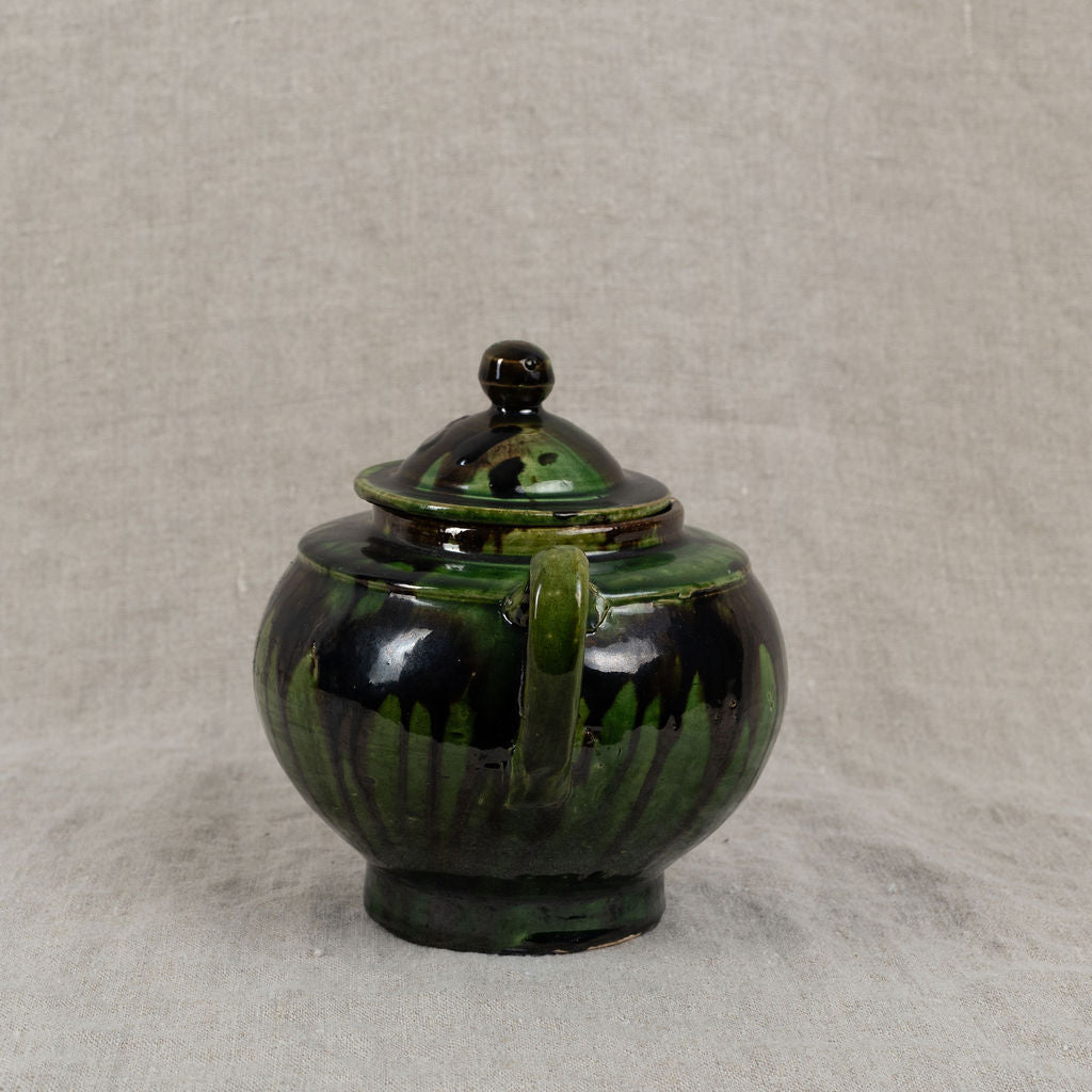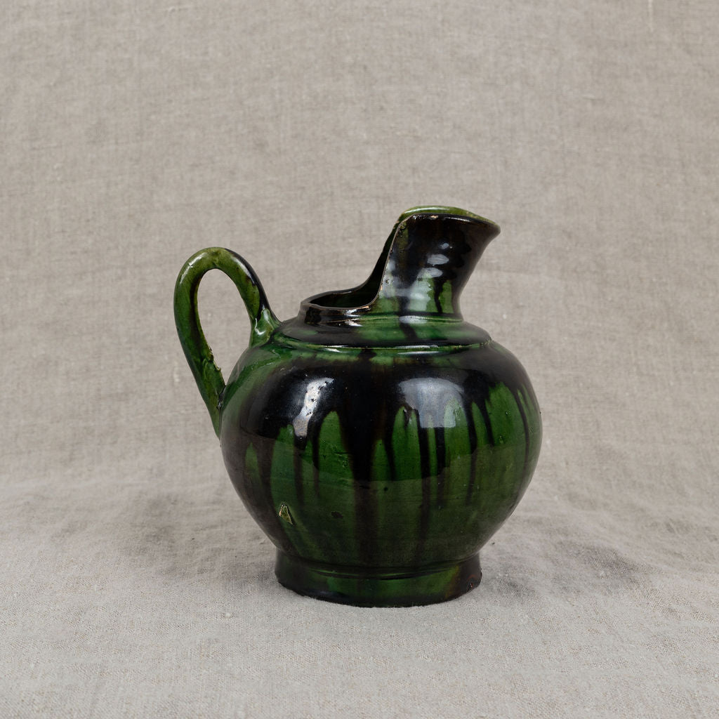 Bring depth and character to your table with this vintage Mexican folk art chocolate and tea set, finished in a rich emerald green drip glaze. The organic, hand-thrown feel and expressive glaze pattern give this artisan pottery set a beautifully rustic presence—perfect for farmhouse, cottage, or eclectic interiors.