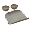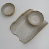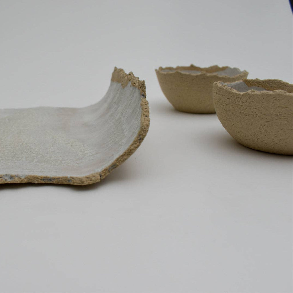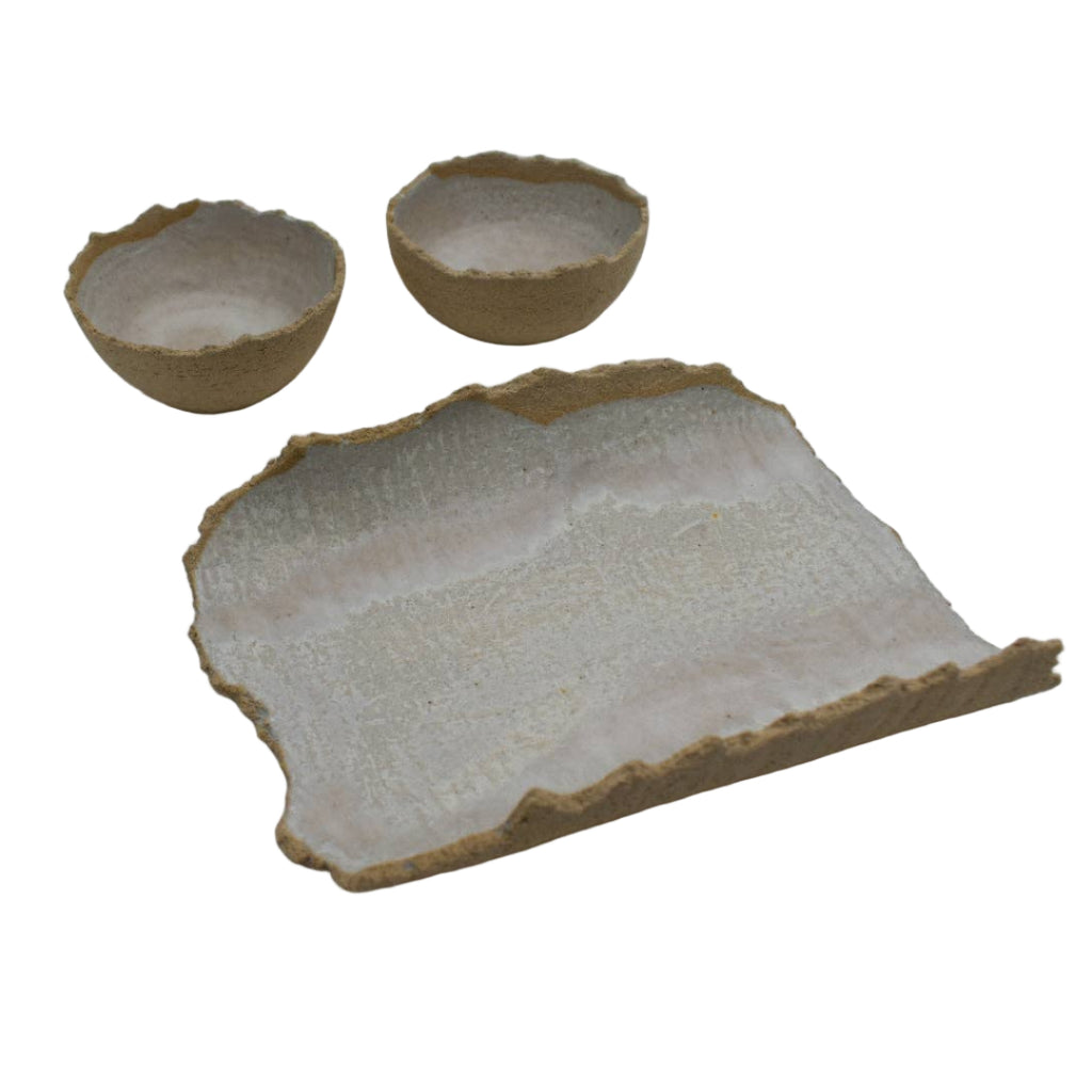 The Yuzu Serving Set features a minimal, wheel-thrown stoneware design that brings natural texture to the table. Crafted from durable clay, the set includes one serving plate and two mini bowls—ideal for sushi, cheese, sauces, or small appetizers. The exterior surfaces are left unglazed to showcase the raw character of the stoneware, while the interiors are finished with a smooth glaze for everyday functionality. Thoughtfully designed for both daily meals and special gatherings, each piece carries subtle variations that reflect its handmade nature.